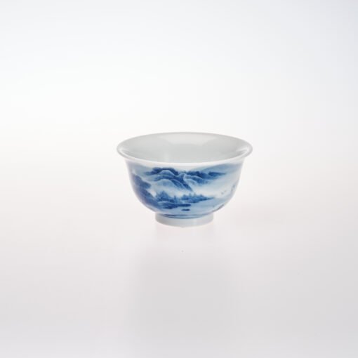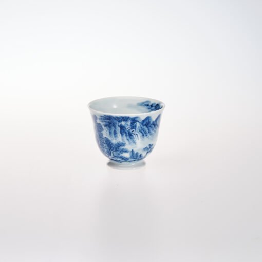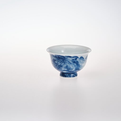 The cup’s curved body (and interior) features a hand-painted underglaze blue shan shui scene: