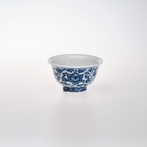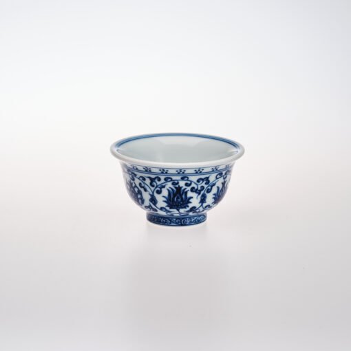 The cup features a continuous underglaze blue peony scroll (known as lianhua wen in Chinese ceramic art):