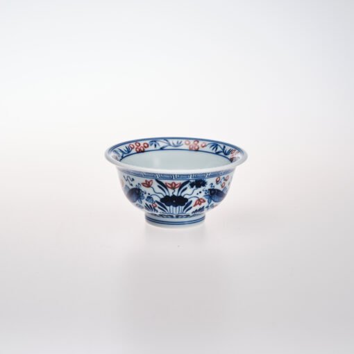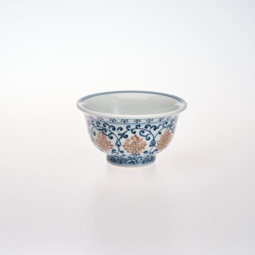 The cup’s body features delicate underglaze blue vines winding around bold underglaze red lotus blooms (lotus = symbol of purity, enlightenment, and good fortune in Chinese culture). The interior centers on a matching red lotus medallion, framed by blue scrolls—revealed like a hidden gem when filled with tea.