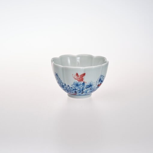 The cup’s scalloped lotus-petal body (a classic shape inspired by Buddhist art, symbolizing purity) is adorned with:
