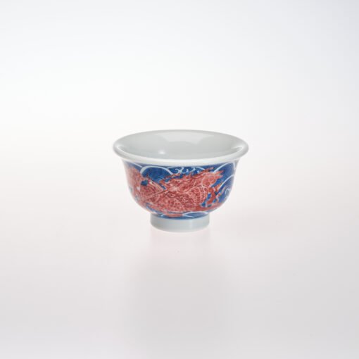The cup’s body features a dynamic underglaze red dragon (a symbol of power, good fortune, and imperial authority in Chinese culture) winding through deep cobalt blue waves: