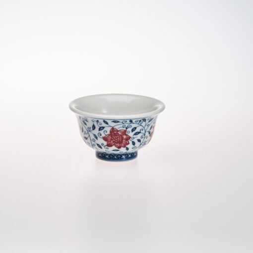 Embrace timeless grace with this handcrafted Lotus & Vine Tea Cup—a harmonious blend of underglaze blue scrollwork and vivid underglaze red lotus blooms, rooted in Chinese artistic tradition.