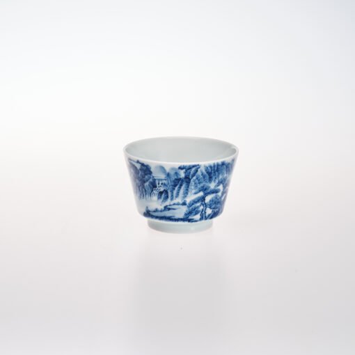 The cup’s body (and interior) features a continuous underglaze blue landscape:
