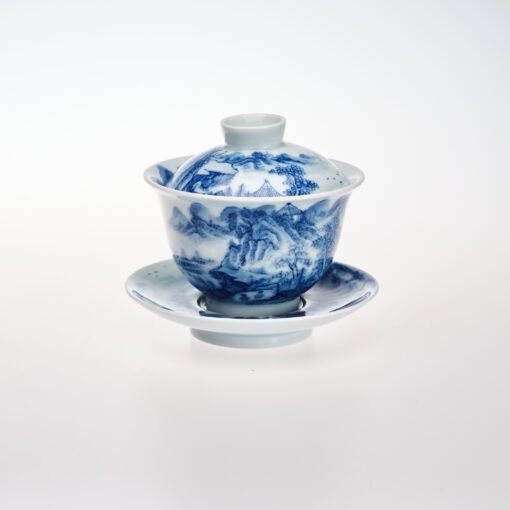 This handcrafted gaiwan features a continuous underglaze blue shan shui (mountain-water) landscape across its bowl, lid, and saucer—embodying the tranquil aesthetic of traditional Chinese landscape painting.