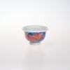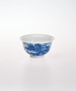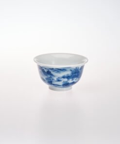 The cup’s curved body (and interior) features a hand-painted underglaze blue shan shui scene:
