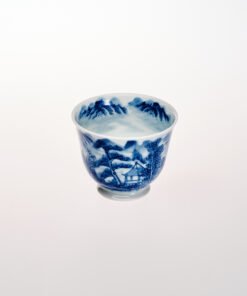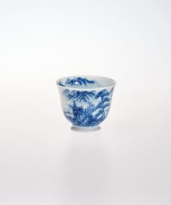 The cup’s body (and interior) features a continuous underglaze blue landscape: